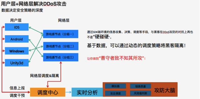 与普通的DDoS高防机房不同,游戏盾并不是通过海量的带宽硬抗攻击,而是通过分布式的抗D节点,将黑客的攻击进行有效的拆分和调度,使得攻击无法集中到某一个点上。同时基于SDK端数据、流量数据,可以通过动态的调度策略将黑客隔离!