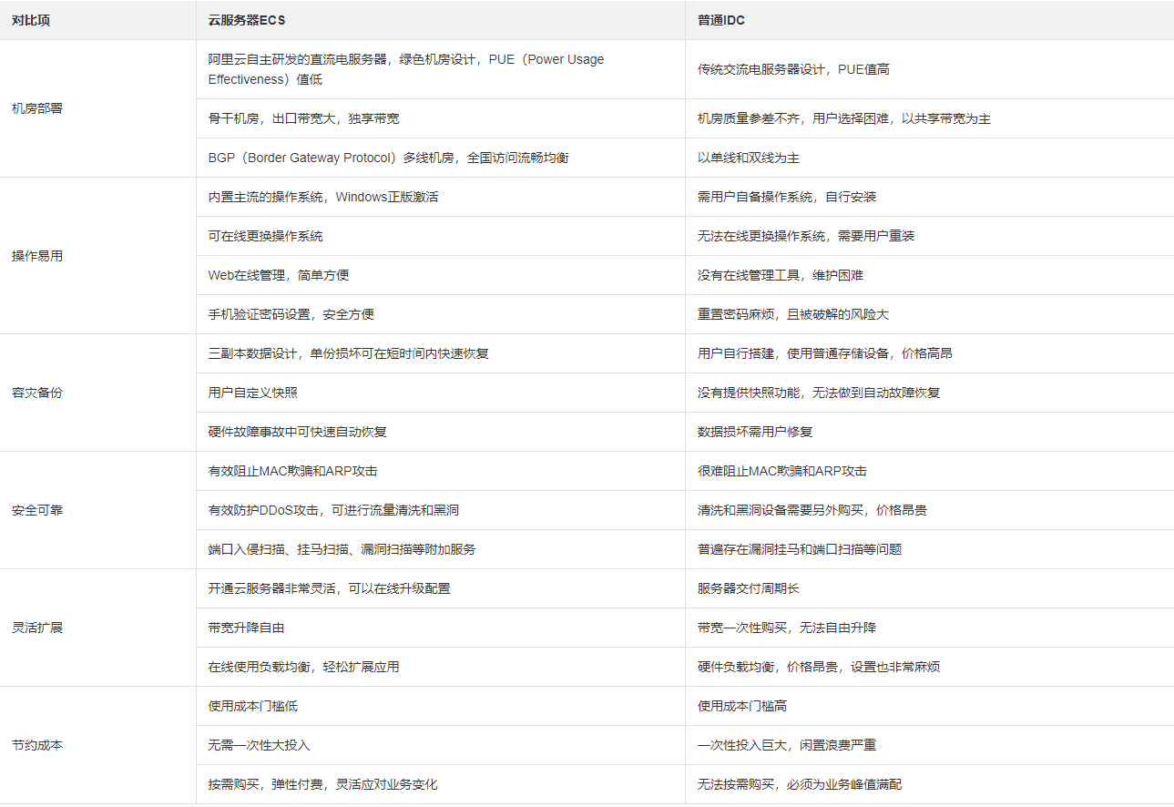 - 云服务器ECS与普通IDC的优势对比如下表所示。