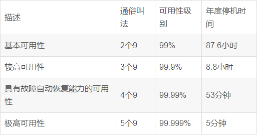 通常用平均无故障时间(MTTF:mean time to failure)来度量系统的可靠性,用平均故障维修时间(MTTR:mean time to restoration)来度量系统的可维护性。于是可用性被定义为:HA=MTTF/(MTTF+MTTR)*100%。