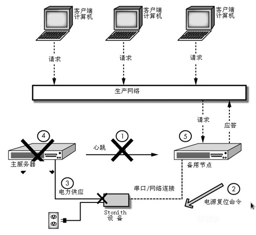 STONITH(Shoot The Other Node in the Head,"爆头") 这种机制直接操作电源开关,控制故障节点的电源开关,通过暂时断电又上电的方式,使故障节点重启,这种方式需要硬件支持。