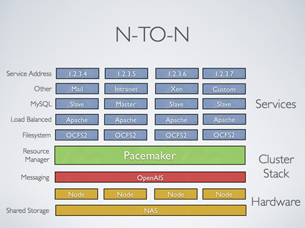 N个主节点N个备用节点。这是A/A双主和N + M模型的组合,N节点都有服务,如果一个坏了,剩下的每个节点都可以作为替代提供服务。如下图,当共享存储是可用的,每一个节点都可能会被用于故障切换。起搏器甚至可以运行服务的多个副本,以分散工作量。