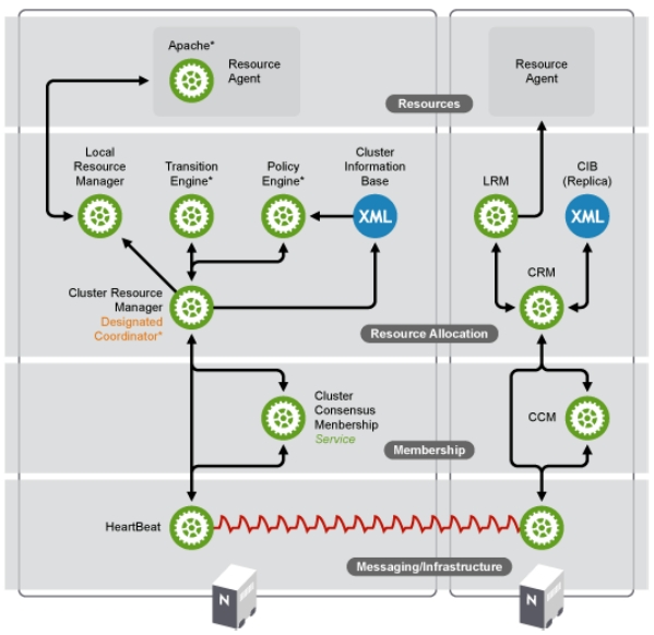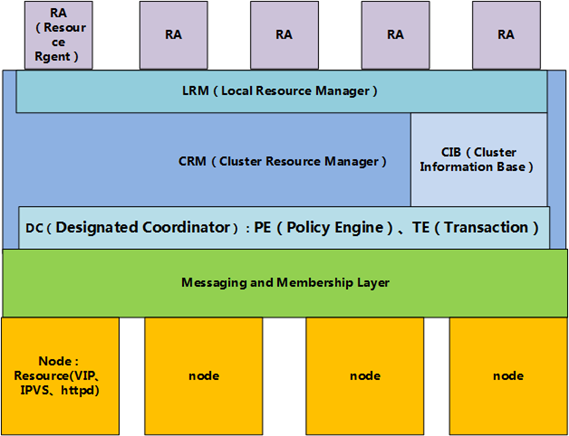 也叫资源管理器层,真正实现集群服务的层。包含CRM(集群资源管理器,cluster Resource Manager),CIB(集群信息基库,Cluster Infonation Base),PE(策略引擎,Policy Engine),TE(实施引擎,Transition Engine), LRM(Local Resource Manager,本地资源管理器)