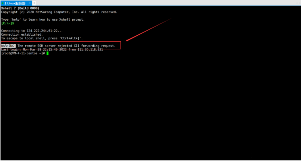 7. 上图出现了一个警告“The remote SSH server rejected X11 forwarding request.”意思是“远程SSH服务器拒绝X11转发请求。”